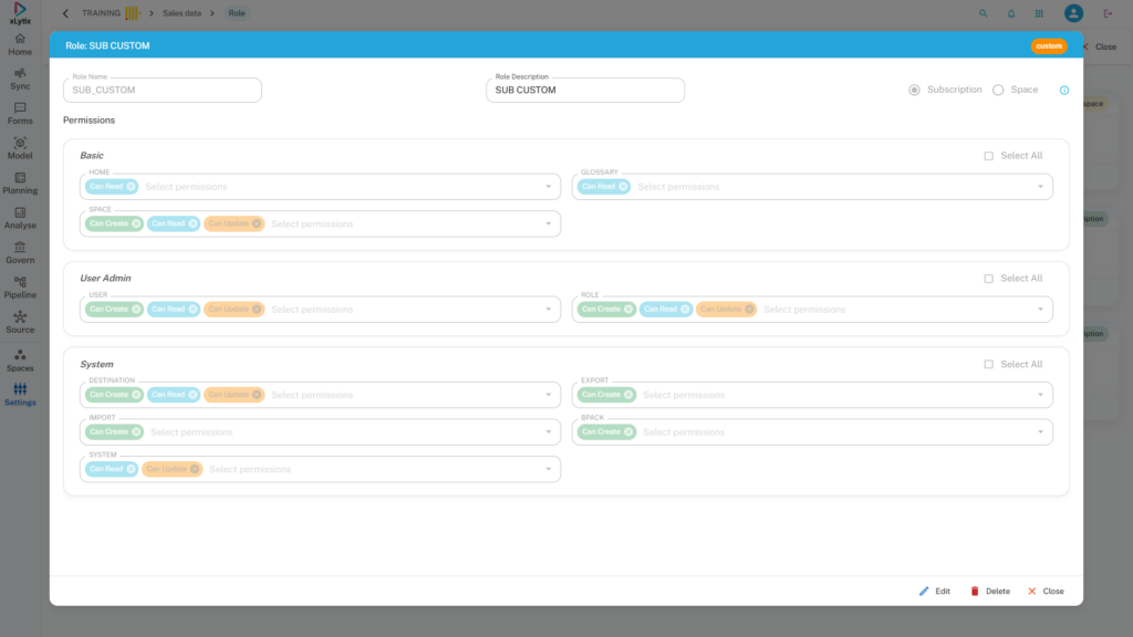 Space level roles allows you to access xLytix functionalities like Sync, Model, Govern, Pipeline, Monitor, Input and Source.