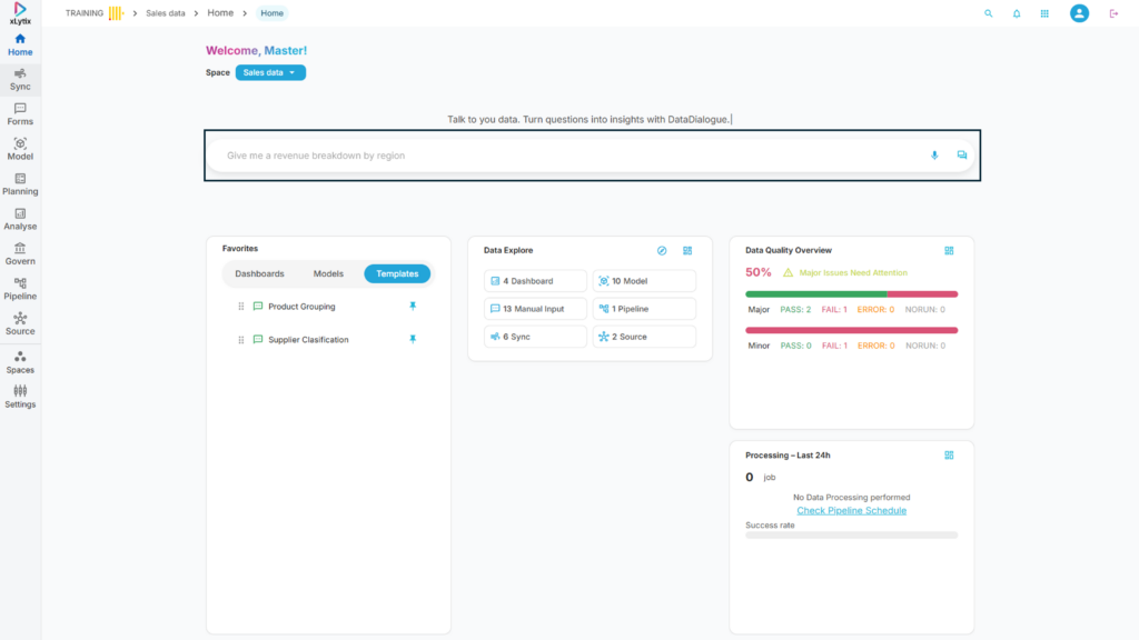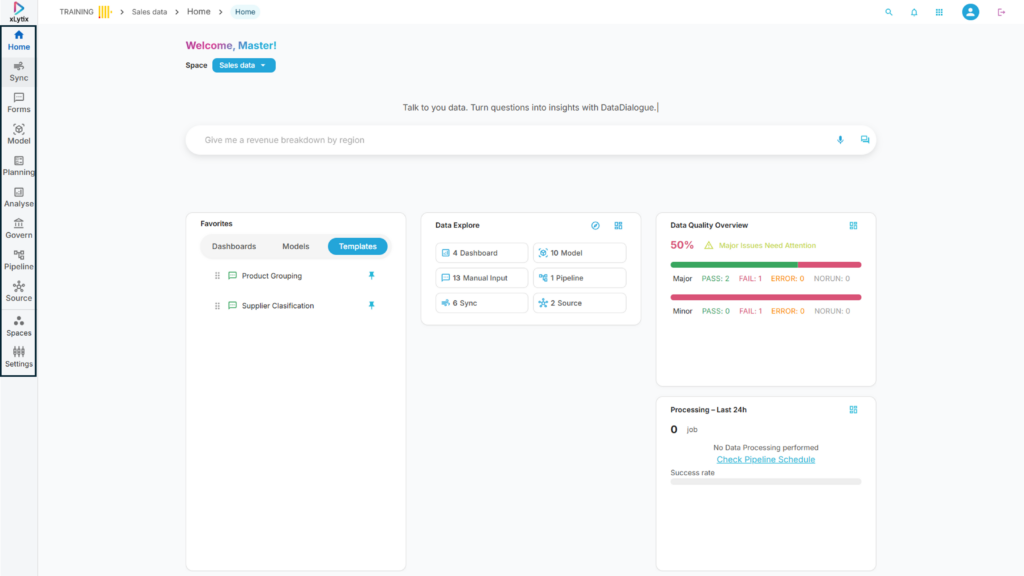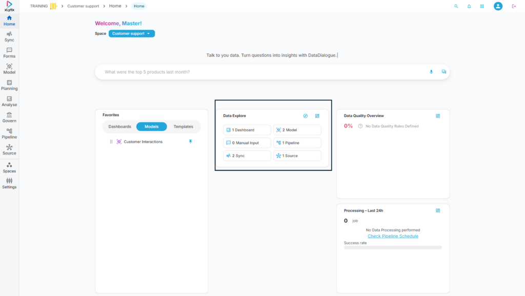 1. Home – Provides an overview of the workspace with quick access to insights, Data Dialogue, and key activities.