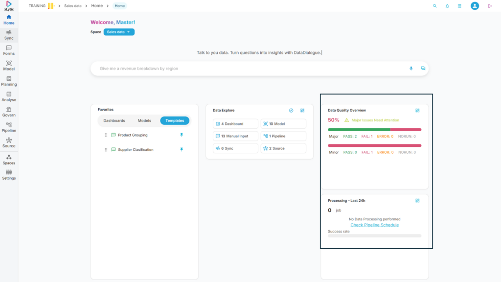 Data Quality Analytics → Provides detailed insights into data quality metrics, test results, and issue distribution across datasets.