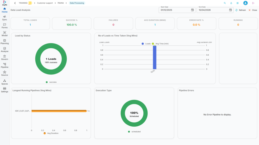 Data Load Analysis → Provides insights into pipeline execution statistics, data load performance, and processing trends over a selected time range.