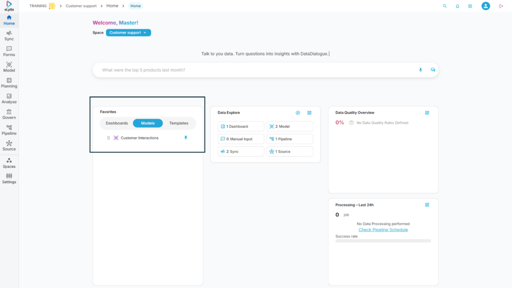 Models → Shows pinned data models for quick access and management.