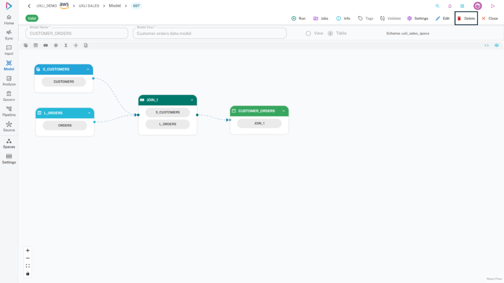 Before deleting any data model, user has to make sure that any objects in xLytix are not dependent on the selected data model. If they are, then they need remove the dependency first and then can proceed with deleting the data model.
