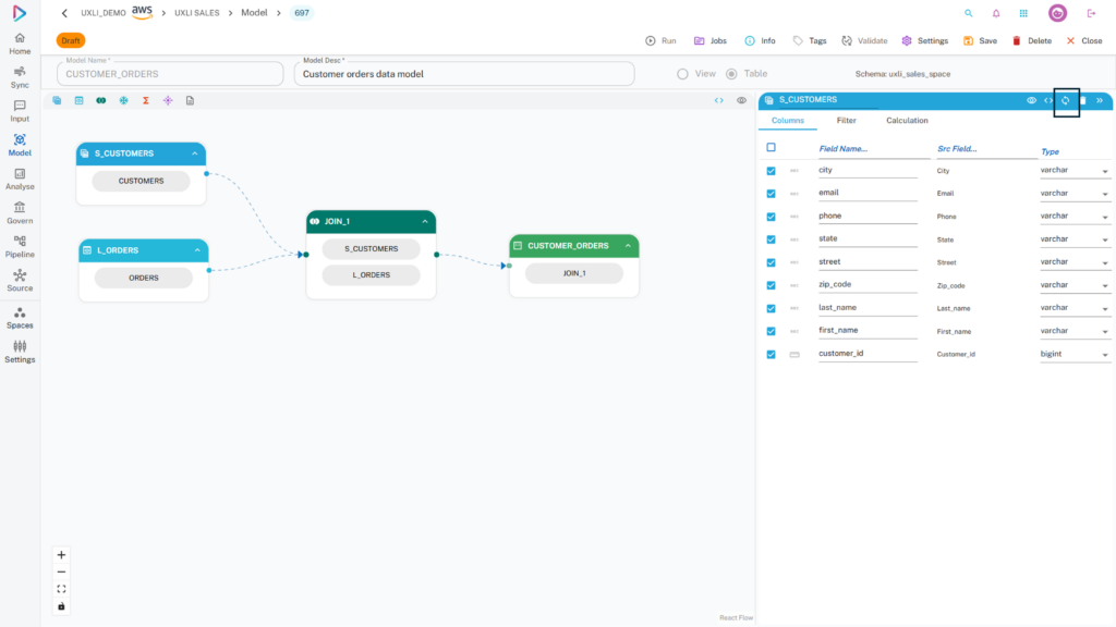 4. Join Node: Users can join one source table with other source tables and apply different types of joins (left, right, inner or full outer) between them. Users can also apply filters to the output data and select the required output fields.