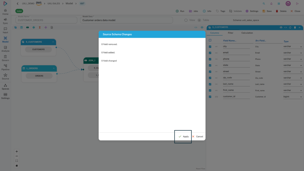 d. Sync All – Allows both addiction or deletion of new columns into the model schema.